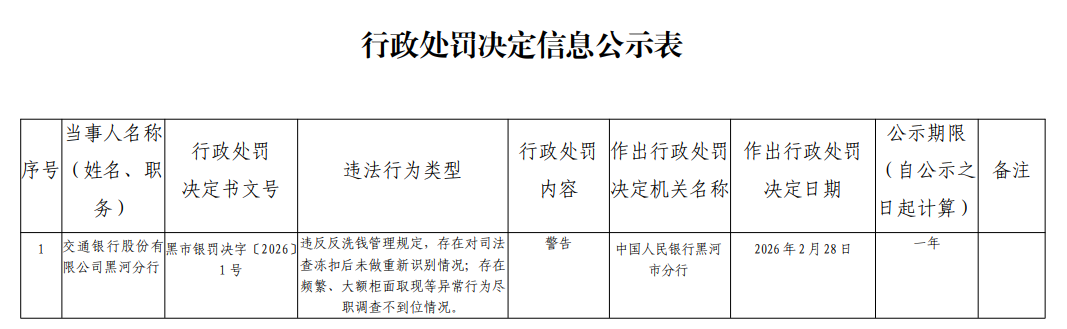 中国人民银行网站近日披露的中国人民银行黑河市分行行政处罚决定信息公示表(黑市银罚决字〔2026〕1号)显示,交通银行股份有限公司黑河分行黑市违反反洗钱管理规定,存在对司法查冻扣后未做重新识别情况;存在频繁、大额柜面取现等异常行为尽职调查不到位情况。中国人民银行黑河市分行对其处以警告。