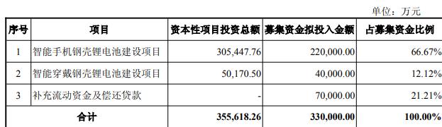 本次向特定对象发行股票募集资金总额不超过人民币330,000.00万元(含本数),扣除相关发行费用后的募集资金净额拟用于智能手机钢壳锂电池建设项目、智能穿戴钢壳锂电池建设项目、补充流动资金及偿还贷款。