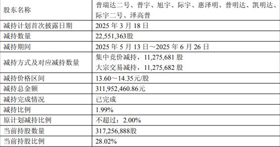 公司2月14日披露关于持股5%以上股东权益变动触及1%刻度的提示性公告,公司近日收到股东宁波汇锦诚创业投资合伙企业(有限合伙)(简称“宁波汇锦诚”)出具的告知函。2025年2月14日至2026年2月5日,公司2023年限制性股票激励计划合计归属股份数量4,899,443股,导致公司股本总数由1,127,286,261股增加至1,132,185,704股。2026年1月20日至2026年2月13日期间,宁波汇锦诚通过集中竞价交易方式减持公司股份10,417,072股。前述因素综合导致宁波汇锦诚持股比例由7.95%变动至7.00%。2025年12月25日,公司披露股东减持股份计划公告,截至公告披露日,公司股东宁波汇锦诚持有公司股份89,636,900股(占公司总股本的7.9180%)。深圳拓金创业投资基金合伙企业(有限合伙)(简称“深圳拓金”)及其一致行动人珠海冷泉投资合伙企业(有限合伙)(简称“珠海冷泉”)分别持有公司股份47,891,800股(占公司总股本的4.2305%)和37,511,300股(占公司总股本的3.3135%),合计持股85,403,100股(占公司总股本的7.5440%)。公司近日分别收到宁波汇锦诚、珠海冷泉出具的告知函,因自身经营管理需要,宁波汇锦诚拟自公告披露之日起15个交易日后的3个月内通过集中竞价交易和大宗交易方式减持其所持有的公司股份合计不超过22,641,377股,即不超过公司总股本的2.00%;珠海冷泉拟自公告披露之日起15个交易日后的3个月内通过集中竞价交易方式减持其所持有的公司股份合计不超过11,320,688股,即不超过公司总股本的1.00%。以2月13日收盘价18.76元计算,宁波汇锦诚减持金额195424270.72元。截至2025年9月30日,宁波汇锦诚为公司第二大股东。
