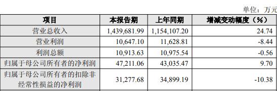 据公司2025年年度业绩快报,2025年度,公司实现营业总收入1,439,681.99万元,较上年同期上升24.74%;实现归属于母公司所有者的净利润47,211.06万元,较上年同期上升9.70%;实现归属于母公司所有者的扣除非经常性损益的净利润31,277.68万元,较上年同期下降10.38%。